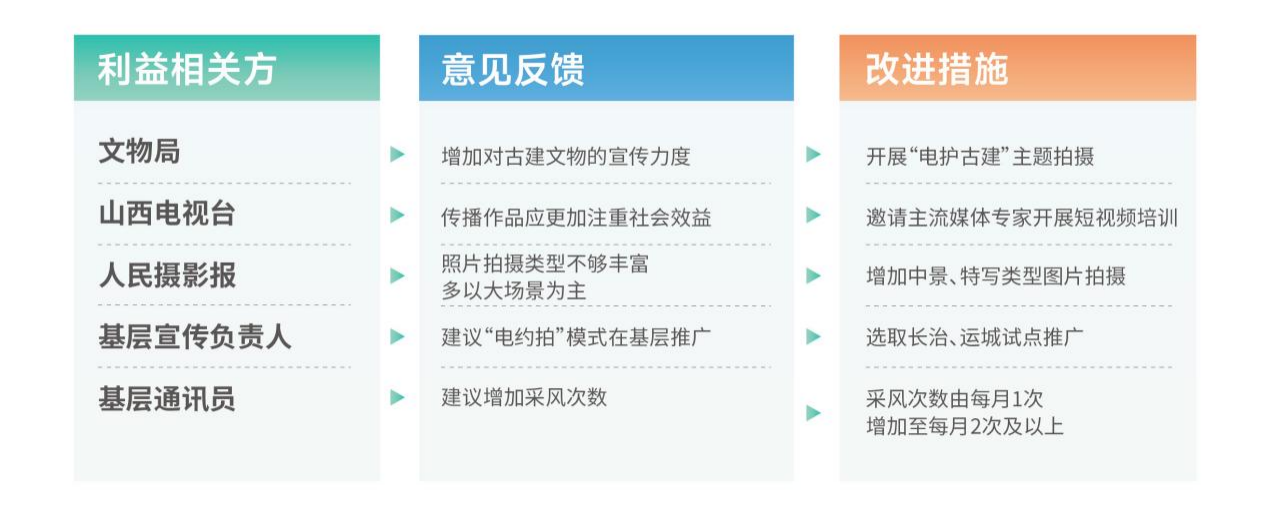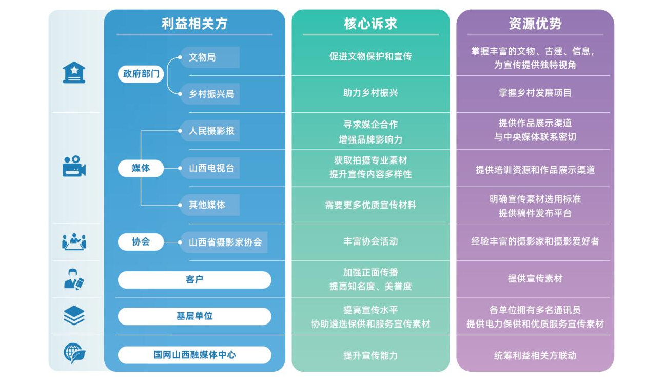 融媒體中心根植合作理念,將利益相關(guān)方拓展至政府部門(mén)(文物局、鄉(xiāng)村振興局等)、媒體(山西電視臺(tái)、人民攝影報(bào)等)、協(xié)會(huì)(山西省攝影家協(xié)會(huì)及市縣協(xié)會(huì)等)、基層單位、客戶(企業(yè)、人民群眾等),精準(zhǔn)識(shí)別分析各利益相關(guān)方的核心訴求與資源優(yōu)勢(shì),搭建多方溝通平臺(tái),確保溝通協(xié)作順暢,推動(dòng)形成優(yōu)勢(shì)互補(bǔ)、資源共享的合作格局。