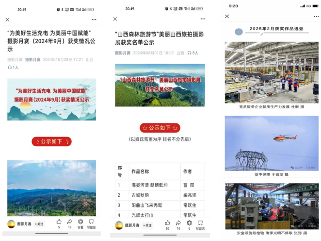“電約拍”2.0項(xiàng)目實(shí)施以來(lái),重點(diǎn)培養(yǎng)團(tuán)隊(duì)成員17名,輻射帶動(dòng)80余名基層通訊員實(shí)戰(zhàn)能力提升,9名同志被山西攝影家協(xié)會(huì)吸收為會(huì)員。2024年,在人民日?qǐng)?bào)、新華社、山西電視臺(tái)、山西日?qǐng)?bào)、國(guó)家電網(wǎng)各類媒體平臺(tái)發(fā)表圖片594幅、視頻報(bào)道335條,分別同比增長(zhǎng)430%、177%,宣傳績(jī)效得到有效提升,為企業(yè)高質(zhì)量發(fā)展?fàn)I造了良好的內(nèi)外部輿論環(huán)境。“電約拍”團(tuán)隊(duì)創(chuàng)作的《稻田喜事》《表里山河處處皆新色》等視頻作品獲得全國(guó)品牌故事大賽一等獎(jiǎng);短視頻“凌空一擊”全網(wǎng)點(diǎn)擊量超2億,評(píng)論、轉(zhuǎn)發(fā)次數(shù)過(guò)萬(wàn)。人民攝影報(bào)先后以三個(gè)整版對(duì)“光影筑夢(mèng) 點(diǎn)亮河?xùn)|”“與光同行 一路奮晉”“光影中的晉電力量”主題進(jìn)行圖文報(bào)道。