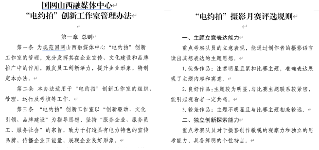 制定《“電約拍”創(chuàng)新工作室管理辦法》《2024年“師帶徒 青藍(lán)計(jì)劃”新聞采訪實(shí)訓(xùn)方案》《圖片資源管理系統(tǒng)管理辦法》《“電約拍”團(tuán)隊(duì)積分獎(jiǎng)勵(lì)辦法》《爭(zhēng)創(chuàng)“七個(gè)最”宣傳成果工作方案》《“為美好生活充電 為美麗中國(guó)賦能”攝影月賽評(píng)選規(guī)則》《“電約拍”采風(fēng)承諾書(shū)》等相關(guān)制度,通過(guò)完善的管理機(jī)制和制度,推進(jìn)了項(xiàng)目規(guī)范化運(yùn)營(yíng)、標(biāo)準(zhǔn)化管理。加強(qiáng)團(tuán)隊(duì)文化建設(shè),“電約拍——佳片有約”團(tuán)隊(duì)師徒8人,通過(guò)附加“葫蘆家族”情愫,打造出“記錄時(shí)代、匠心傳承”的團(tuán)隊(duì)文化。