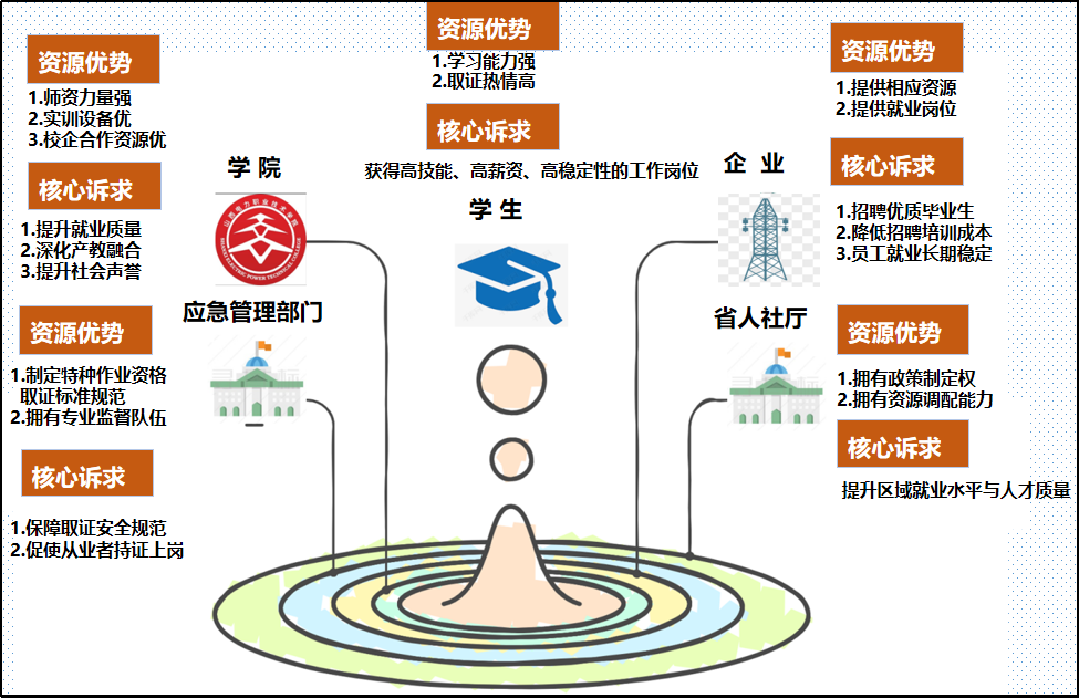針對上述問題,學(xué)院精準識別利益相關(guān)方,通過“校政合作取證、校企合作育才、雙線協(xié)同育人”,開辟高技能、高薪資、高穩(wěn)定性的高質(zhì)量就業(yè)新賽道,為電力行業(yè)輸送優(yōu)質(zhì)高技能人才,回應(yīng)“實現(xiàn)高質(zhì)量就業(yè)”的時代命題。