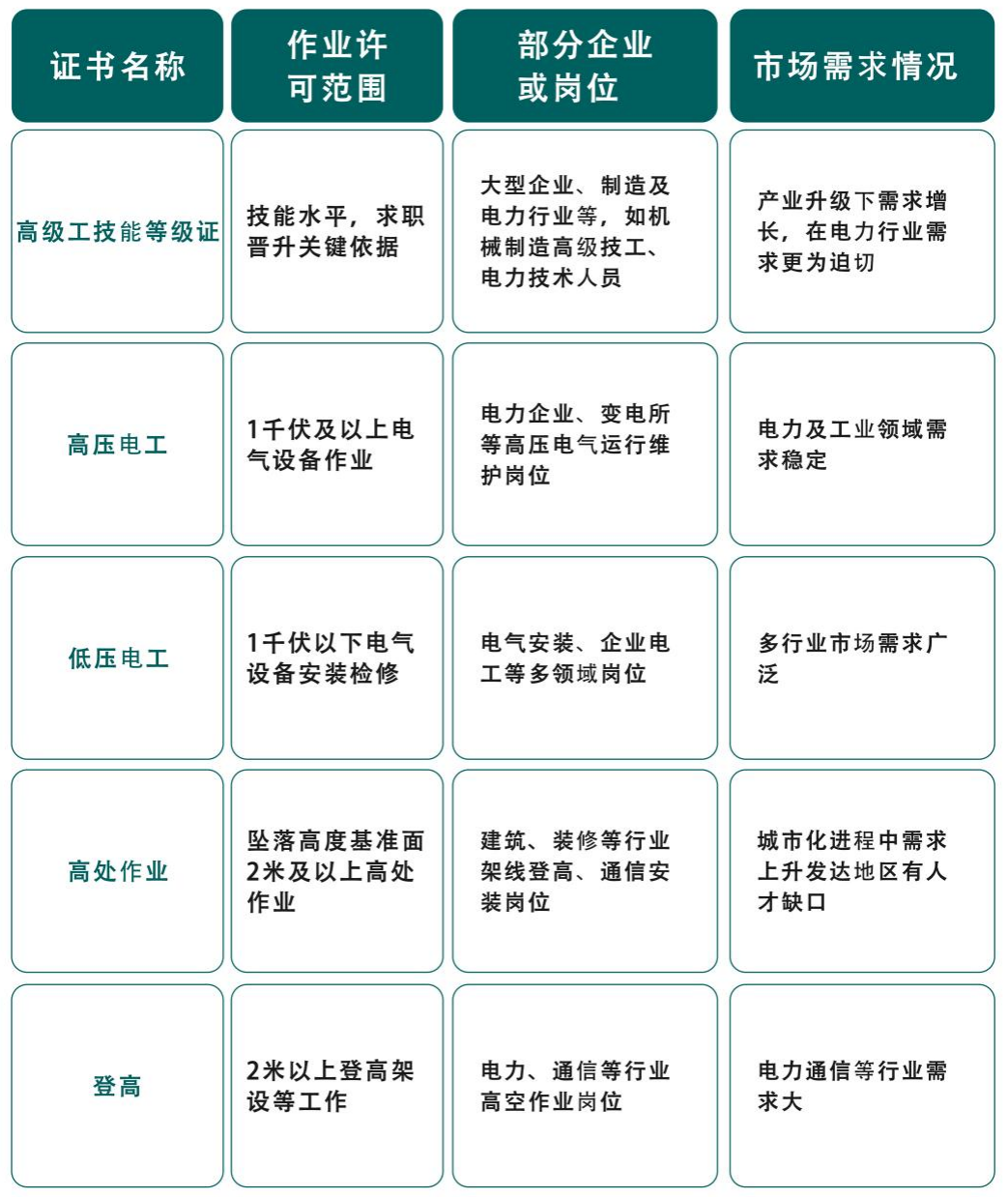 1.明確“取什么證”。通過深入調(diào)研23家企業(yè)及分析省人社廳發(fā)布的電力人才需求數(shù)據(jù),精準鎖定高級工技能等級證(85%企業(yè)薪資依據(jù))、高壓電工證(電網(wǎng)作業(yè)強制要求)、低壓電工證(需求年增12%)、登高作業(yè)證(高空作業(yè)必備)、高處作業(yè)證(降低事故率60%)。這些均為國家準入類資質(zhì),覆蓋電力行業(yè)92%崗位需求和80%高危作業(yè)場景,確保學(xué)生獲得的每一項資質(zhì)都能直接提升就業(yè)競爭力和職業(yè)發(fā)展空間。