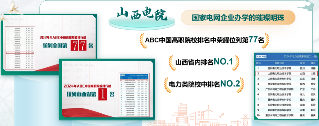 2024年ABC中國高職院校排名中,學(xué)院位列全國第77名、省內(nèi)第1名、電力類院校第2名。率先開展的“1+4”取證工作在全省51所職業(yè)院校及國網(wǎng)系統(tǒng)內(nèi)12所電力高職院校中獨樹一幟,形成可復(fù)制的高職高質(zhì)量就業(yè)“電院方案”,彰顯國網(wǎng)公司在教育領(lǐng)域積極履行社會責任、推動行業(yè)發(fā)展的擔當與作為。