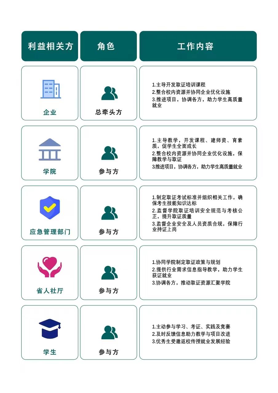 精準識別企業(yè)、應(yīng)急管理部門、省人社廳、學(xué)院、學(xué)生等利益相關(guān)方。通過深度調(diào)研(問卷+座談)梳理各方利益訴求,堅持“專業(yè)主導(dǎo)、協(xié)同聯(lián)動”原則,厘清利益相關(guān)方責任邊界,建立“需求對接-資源整合-方案共商”的協(xié)作模式,形成多方聯(lián)動就業(yè)質(zhì)量提升方案。
