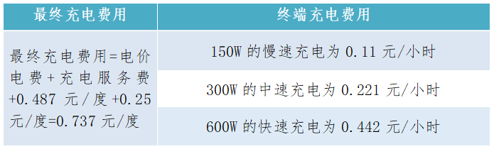 據(jù)市場統(tǒng)計,運營商充電服務費一般為:0.4-0.6元/度。為進一步降低充電費用,引入充電站廣告商,將廣告租金的60%補貼至充電站運營商,以降低充電服務費,根據(jù)盈利效益測算,同運營商溝通,可降低充電服務費至0.12-0.25元/度,按0.25元/度計算最終充電費用如下表所示。